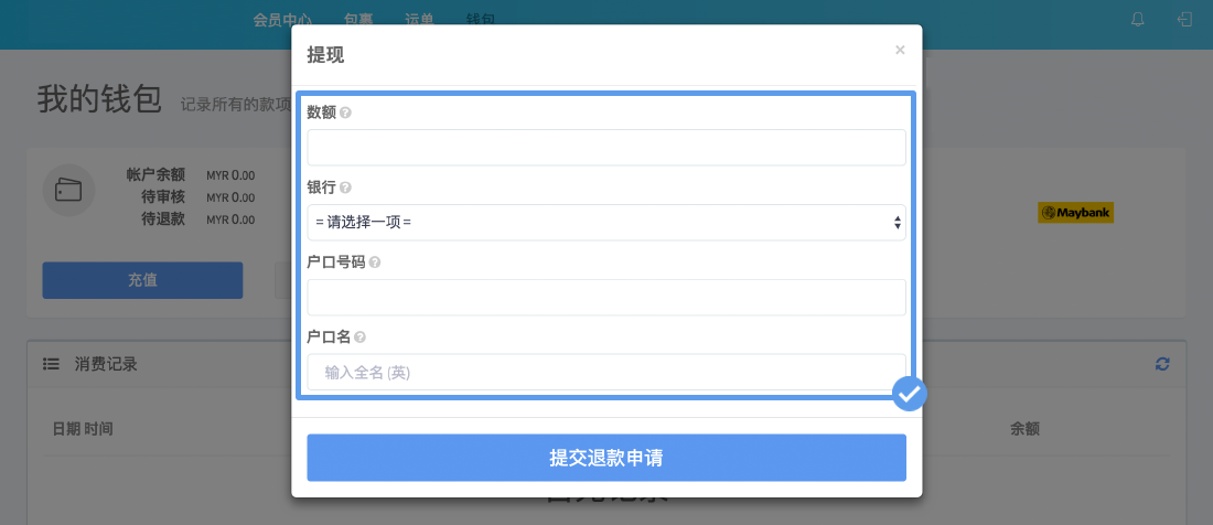 用户在我们平台里的余额是能退款或提现的。只需简单几步骤就能提交提现申请,财务部门会在48小时的工作日将款项退回给用户提供的银行户口。所有退款将收取RM1的处理费用。
